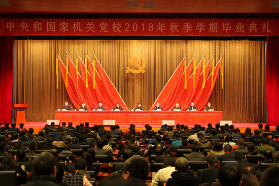 這是新成立的中央和國家機關黨校第一期主體班畢業典禮。中央和國家機關工委委員、辦公廳主任劉濤,中央和國家機關工委組織部負責同志出席典禮。2018年秋季學期司局級干部進修班、處級干部進修班、青年干部培訓班學員及中央和國家機關黨校干部職工約400人參加畢業典禮。