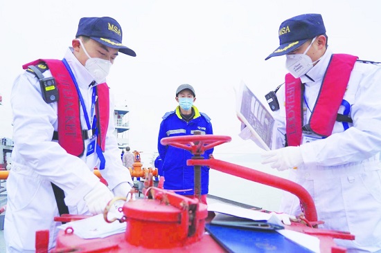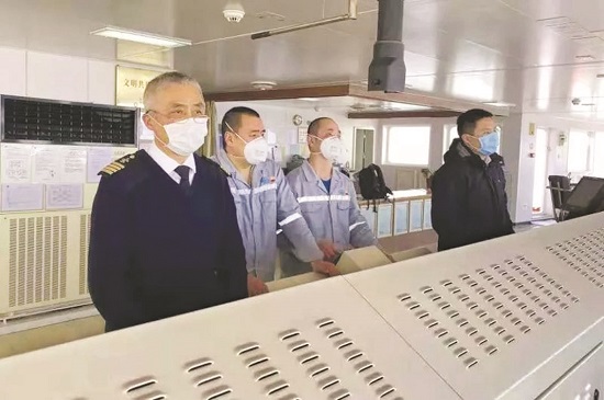 長江引航中心南京引航站高級引航員匡冠生(左一)是名老黨員,疫情當前,他一天都沒有休息,把一船船物資安全及時引領進港。