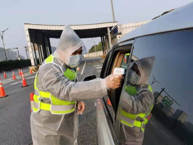 春節假期剛結束,在杭甬高速德勝出口,進城的車輛早已排起了長龍?!澳?!請停下接受檢查?!薄罢垎柦谟腥ミ^湖北嗎?”“您的體溫偏高,請靠邊停車,等待二次測量?!鄙泶┓雷o裝備、手持測溫儀的孫吉寶耐心地為每一名返杭司乘人員測量體溫,為全市防范新型冠狀病毒盡心盡力守好第一道關口。