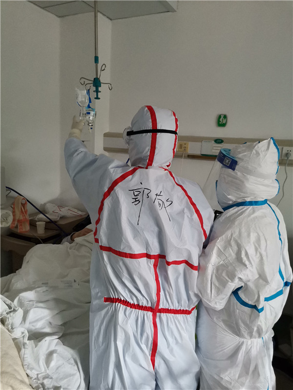 2020年春節,新冠肺炎防控戰役全面打響,郭敬積極請戰,放棄照顧年邁癱瘓在床的父親,離開了回國團聚的兒子。1月25日(大年初一),她帶著廣安門醫院全體醫護人員的祝福,作為第一批醫療隊員進駐武漢金銀潭醫院。作為醫療隊護理工作負責人,她身先士卒,率先進入南一區病房了解情況。由于新冠肺炎為新型傳染病,且南一區病房護理團隊大部分為西醫護士,因此在病房管理和中醫護理方面均存在較多困難。在這種情形下,她與當地護理團隊一起迅速開展工作,進一步規范護理工作內容與流程、細化崗位職責,為全面開展中西醫聯合救治工作打好基礎。