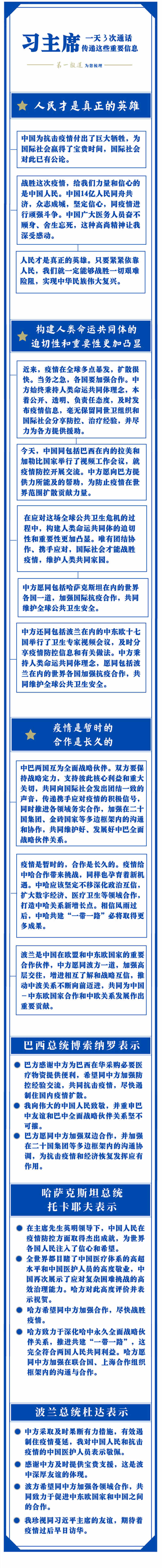 頻密互動,高效溝通。習主席通話內容信息量很大:介紹中國抗疫努力,深化國際抗疫合作,推動雙邊關系發展……其中,“合作”與“人類命運共同體”是習主席反復提到的關鍵詞。