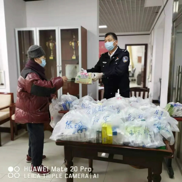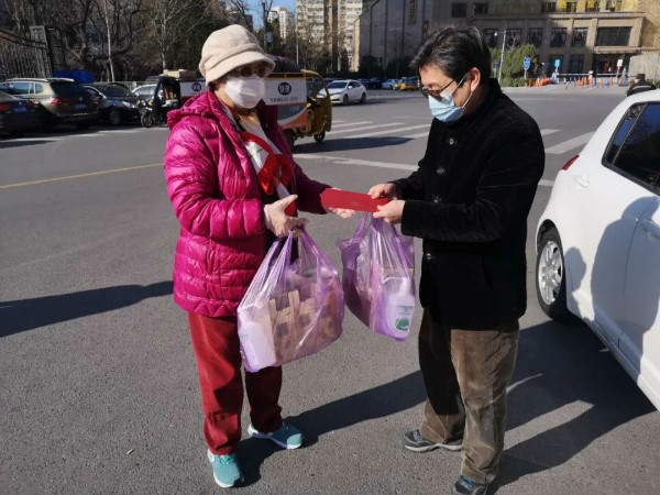廣渠門活動站站長朱山林為老同志分發防疫物資