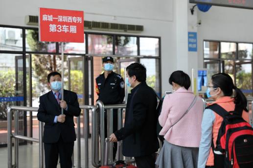 鄂東革命老區“點對點”返崗務工專列搭載1410位外出務工人員駛往深圳西站。麻城車務段安排人員分車廂舉牌引導務工人員經過體溫監測、證件查驗、行李安檢后快速有序進站乘車。 張周凱/攝