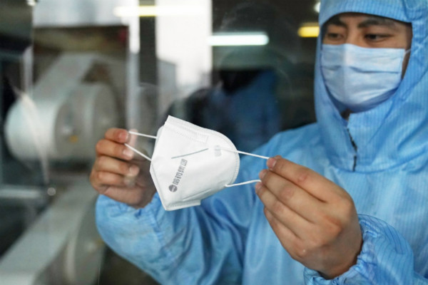 3月2日,在黑龍江省哈爾濱市,工作人員在哈藥總廠的醫用防護口罩生產線旁展示剛生產出的口罩。