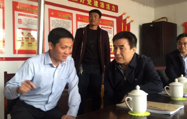 作者(前排右)在扶貧調研中與駐村第一書記交談。