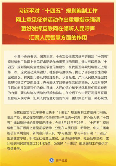 除此之外,有關部門還通過互聯網就“十四五”規劃編制向全社會征求意見和建議,這在我國五年規劃編制史上是第一次。今年8月16日至29日,“十四五”規劃編制工作開展網上意見征求活動,分別在人民日報、新華社、中央廣播電視總臺所屬官網、新聞客戶端以及“學習強國”學習平臺開設“十四五”規劃建言專欄,聽取全社會意見建議?;顒咏M織有序,社會反響熱烈,累計收到網民建言超過101.8萬條,為做好“十四五”規劃編制工作提供了有益參考。