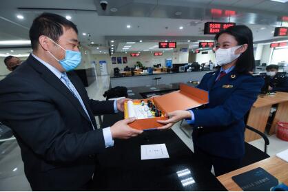 4月22日,在浙江省湖州市吳興區政務服務中心內,吳興區市場監管局工作人員 (右)將包括營業執照、公章、涉企政策宣傳資料等在內的創業服務大禮包遞給企業開辦者,完成了創業企業登記的全部手續