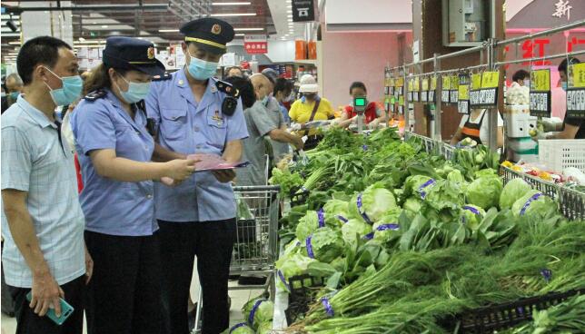 6月28日,北京市豐臺區宛平城地區市場監督管理執法人員在超市中檢查蔬菜溯源情況