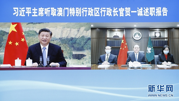 1月27日,國家主席習近平在北京以視頻連線方式聽取了澳門特別行政區行政長官賀一誠2020年度的述職報告。新華社記者 劉彬 攝