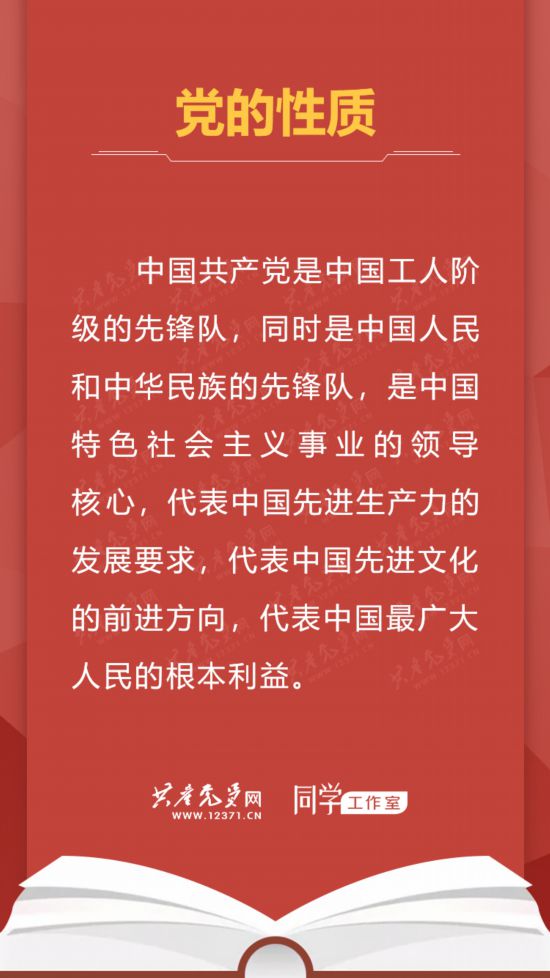 中國共產黨是中國工人階級的先鋒隊,同時是中國人民和中華民族的先鋒隊,是中國特色社會主義事業的領導核心,代表中國先進生產力的發展要求,代表中國先進文化的前進方向,代表中國最廣大人民的根本利益。