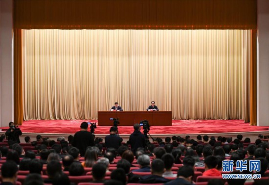 3月16日,中央宣講團成員、中央黨史和文獻研究院院長曲青山(右)在報告會上作宣講報告。新華社記者 陳曄華 攝