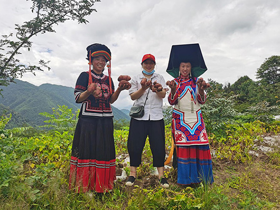 >> 通過扶貧小額信貸脫貧致富的云南省怒江傈僳族自治州瀘水市建檔立卡貧困戶與銀行信貸員(中)分享豐收喜悅。