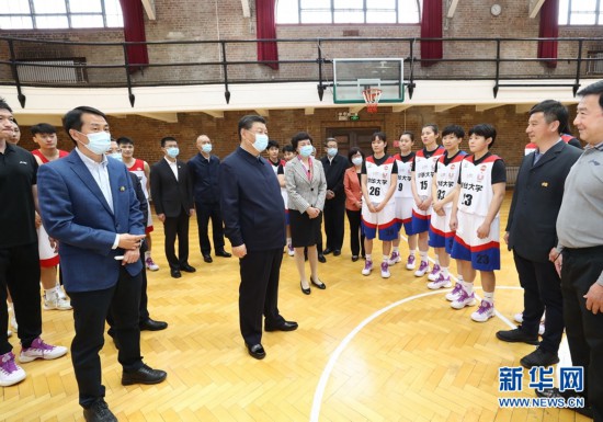 4月19日,在清華大學建校110周年校慶日即將來臨之際,中共中央總書記、國家主席、中央軍委主席習近平來到清華大學考察。這是習近平在清華大學西體育館籃球場同?;@球運動員親切交談。新華社記者 鞠鵬 攝