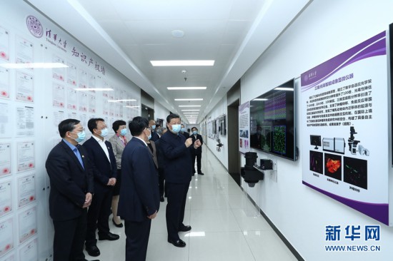 4月19日,在清華大學建校110周年校慶日即將來臨之際,中共中央總書記、國家主席、中央軍委主席習近平來到清華大學考察。這是習近平在清華大學成像與智能技術實驗室,結合展板、電子屏幕察看實驗室開展計算光學、腦科學與人工智能交叉科學實驗研究和開發新科技應用場景情況,聽取實驗室理論研究、技術攻關、成果轉化應用等情況介紹。新華社記者 鞠鵬 攝
