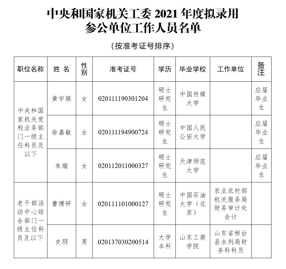 根據2021年度中央機關及其直屬機構考試錄用公務員工作有關要求,經過筆試、面試、體檢和考察等程序,擬錄用徐嘉敏等5人為中央和國家機關工委參公單位工作人員,現予以公示。公示期間如有問題,請向中央和國家機關工委組織部反映。