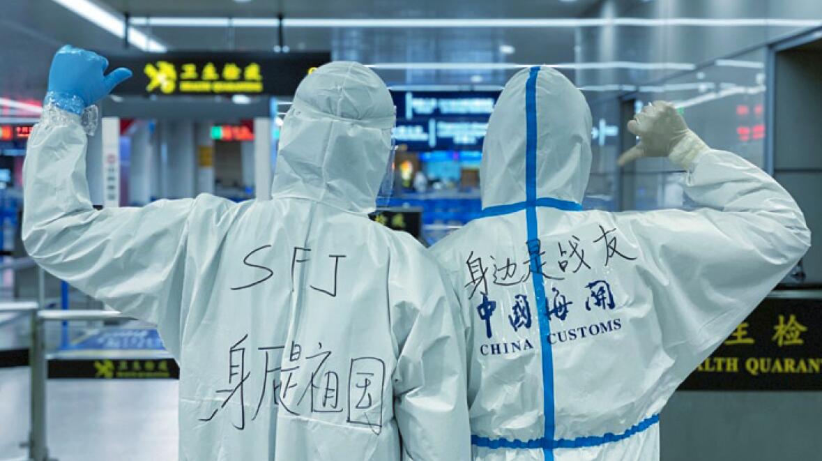 >> 2020年3月16日,上海海關關員與上海市志愿者在浦東國際機場為 入境旅客進行健康云填報和流調。