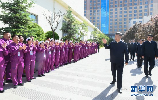 6月7日至9日,中共中央總書記、國家主席、中央軍委主席習近平在青??疾?。這是7日下午,習近平在青海圣源地毯集團有限公司考察時,向企業職工揮手致意。新華社記者 李學仁 攝