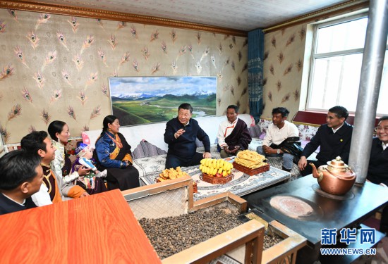 6月7日至9日,中共中央總書記、國家主席、中央軍委主席習近平在青??疾?。這是8日下午,習近平在海北藏族自治州剛察縣沙柳河鎮果洛藏貢麻村,同藏族牧民索南才讓一家人圍坐在客廳聊家常。新華社記者 謝環馳 攝