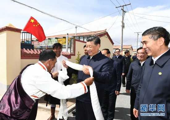 6月7日至9日,中共中央總書記、國家主席、中央軍委主席習近平在青??疾?。這是8日下午,習近平在海北藏族自治州剛察縣沙柳河鎮果洛藏貢麻村考察時,藏族牧民索南才讓向習近平獻上哈達。新華社記者 謝環馳 攝