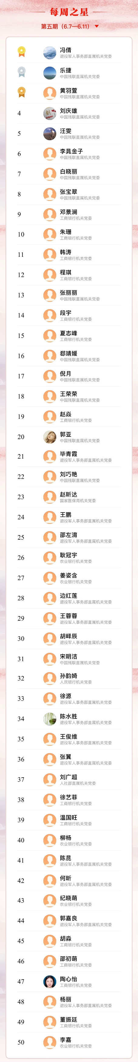 “黨在我心中”中央和國家機關青年黨史知識大賽產生了第五期每周之星50名。初賽階段已截止,敬請關注7月決賽。您可繼續登錄系統答題,但不計入成績。