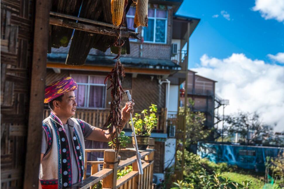 >> 在云南省怒江州福貢縣匹河怒族鄉老姆登村,怒族群眾郁五林在自家開的客棧直播怒江大峽谷美景。