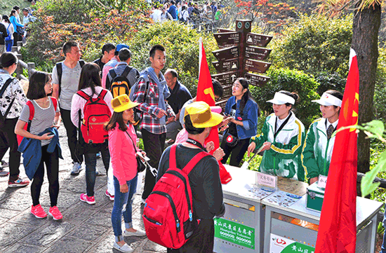 近年來,黃山風景區黨工委充分發揮黨建引領作用,不斷健全迎客松“亮身份、亮服務、亮形象”黨群志愿服務機制,引導各基層黨組織和廣大黨(團)員帶頭提升“四項服務”(服務景區保護管理發展、服務廣大游客、服務職工群眾和服務周邊社區)能力,進一步提升景區志愿服務工作水平,讓一個個志愿者成為在黃山之巔高高揚起的一面面鮮艷旗幟,傾力繪就“生態文明樣板、美麗中國名片,名錄遺產地典范、旅游目的地標桿”的愿景目標。