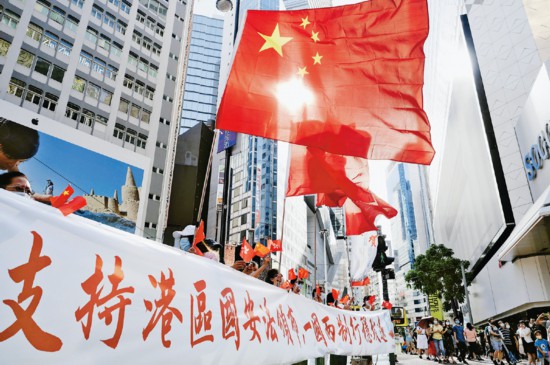 2020年6月30日,十三屆全國人大常委會第二十次會議表決通過《中華人民共和國香港特別行政區維護國家安全法》。這部法律對香港維護國家安全制度機制作出了法律化、規范化、明晰化的具體安排,為維護國家安全和香港長治久安、長期繁榮發展,保障香港居民依法享有的權利和自由,保護外國人在香港的合法權益,增強外國投資者對香港的信心,確?!耙粐鴥芍啤笔聵I行穩致遠,提供了法律支撐和根本保障。圖為6月30日,香港市民在銅鑼灣街頭支持實施香港國安法。 新華社記者 王申/攝