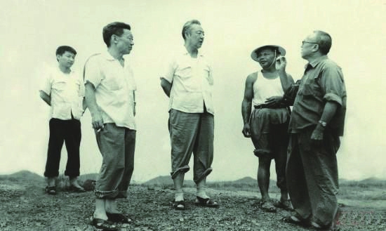 1978年8月,習仲勛(左三)在廣東惠陽農村調研。在清華大學學習的習近平(左一)利用暑假時間參加社會實踐,隨同父親一起下鄉