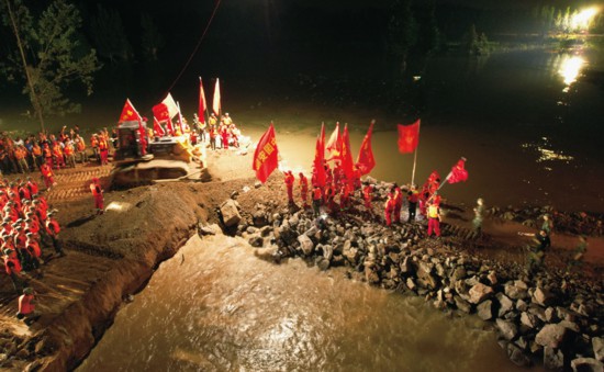 2021年7月17日至23日,河南持續遭遇極端強降雨天氣。7月22日,鶴壁市??h新鎮鎮彭村段衛河大堤發生決口。前來救援的中國安能集團在搶險一線成立4個黨小組,分別負責現場指揮、決口封堵、裹頭加固、綜合保障工作。在黨小組的組織下,現場169名救援人員匯聚成沖不垮的“紅色堤壩”,經過70多個小時的艱苦奮戰,終于使衛河大堤決口合龍。這是2021年7月26日凌晨決口成功合龍后,救援人員在大堤上揮舞紅旗(無人機照片)。 新華社發 張小明/攝