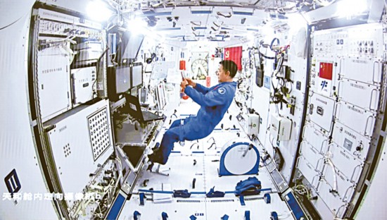 2021年6月17日,神舟十二號載人飛船發射升空。飛船搭載了一面黨旗,這面黨旗在中國共產黨成立100周年之際進入中國空間站內,經歷了我國空間站階段首次載人飛行任務取得圓滿成功的全過程。圖為2021年7月4日,在北京航天飛行控制中心大屏拍攝的天和核心艙內航天員聶海勝配合支持兩名出艙航天員開展艙外操作。 新華社記者 金立旺/攝