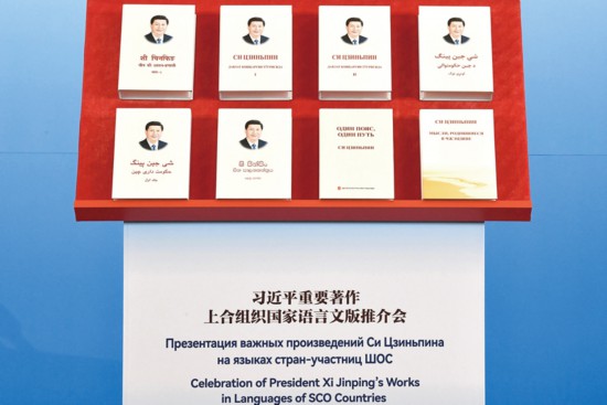 圖為2021年11月17日,習近平重要著作上合組織國家語言文版推介會在北京舉行,《習近平談治國理政》第一卷印地文、普什圖文、達里文、僧伽羅文、烏茲別克文,第二卷烏茲別克文和《之江新語》《習近平談“一帶一路”》俄文版等8種新書在推介會首發。 新華社記者 李賀/攝