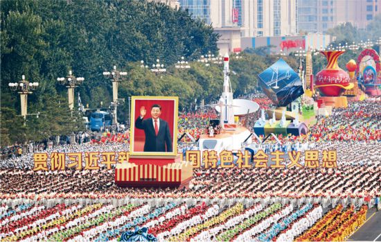 習近平新時代中國特色社會主義思想是當代中國馬克思主義、二十一世紀馬克思主義,是中華文化和中國精神的時代精華,實現了馬克思主義中國化新的飛躍。圖為2019年10月1日,慶祝中華人民共和國成立70周年大會群眾游行中的“偉大復興”方陣。 新華社記者 琚振華/攝