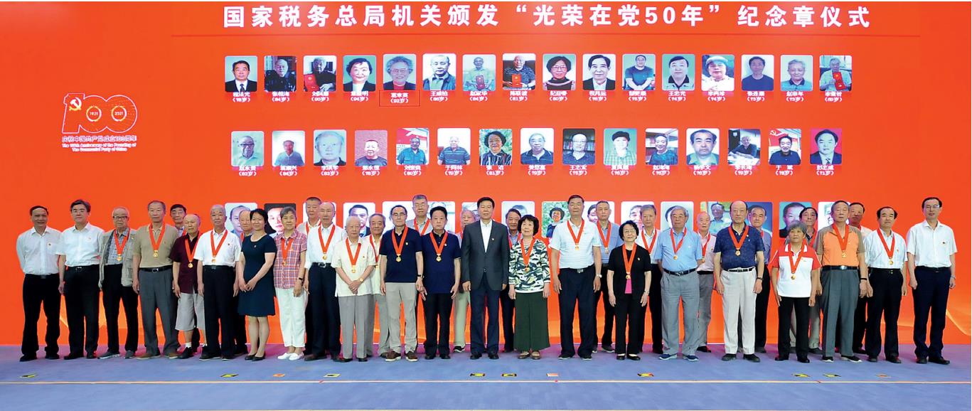 >> 國家稅務總局于2021年6月28日召開慶祝中國共產黨成立100周年暨“兩優一先”表彰大會,向稅務總局機關老黨員頒發“光榮在黨50年”紀念章。