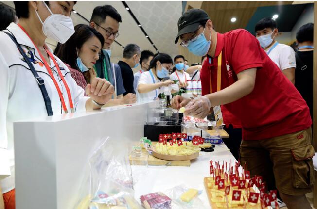 >> 在??谑虚_幕。圖為在海南國際會議展覽中心時尚生活展區,參觀者排隊體驗來自瑞士的奶酪。