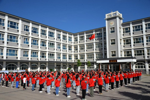 臨城縣圍場中心小學學生在工委援建的新教學樓前舉行升旗儀式。