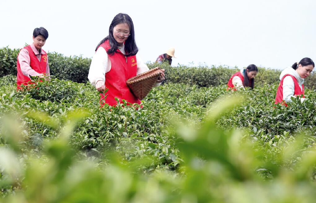 江西省宜春市宜豐縣同安鄉青年黨員志愿者幫助茶農搶摘鮮茶。