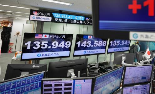 >> 這是6月23日在日本東京一家外匯經紀公司拍攝的匯率顯示屏。在東京外匯市場,日元貶值壓力加大。