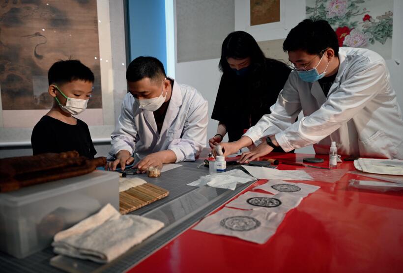 >> 8月10日,“片羽重輝——國家博物館文保成果展”開幕。圖為國家博物館工作人員展示金石傳拓技藝。
