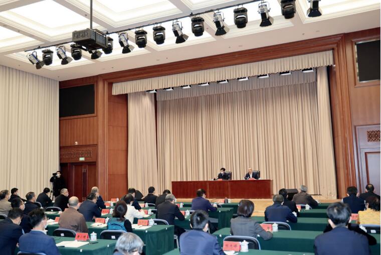 >> 2021年12月7日,作者(主席臺左)向生態環境部系統全體黨員干部宣講黨的十九屆六中全會精神。
