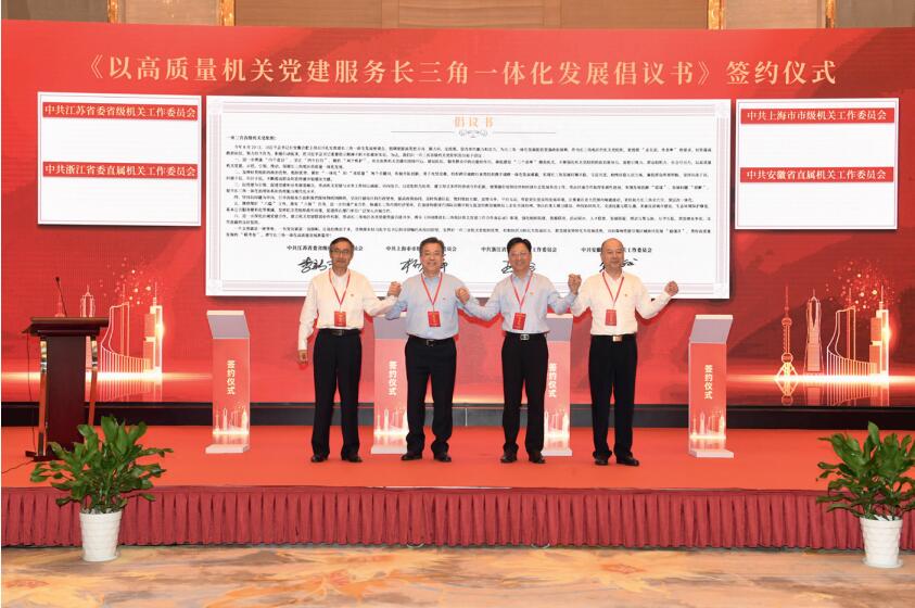 >> 2020年10月,蘇滬浙皖機關工委在南京共同簽訂《以高質量機關黨建服務長三角一體化發展倡議書》
