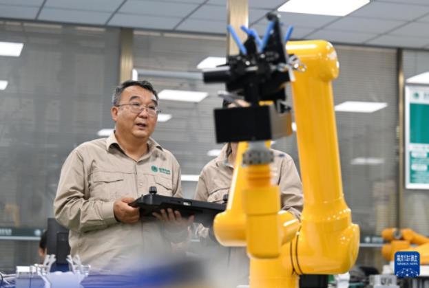 張黎明和同事在調試第四代配網帶電作業機器人(2022年9月8日攝)。新華社記者 趙子碩 攝