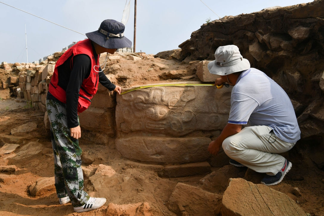 >> 8月6日,考古人員對陜西神木石峁遺址皇城臺新近出土的石雕進行測量。