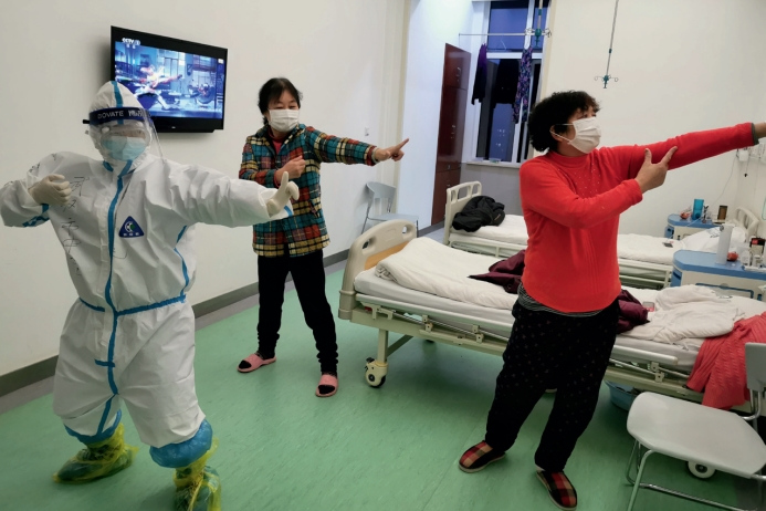 >> 面對新冠肺炎疫情,中醫外治法“多管齊下”。圖為2020年3月7日,武漢市中醫醫院醫護人員帶領患者練習強身健體八段錦。