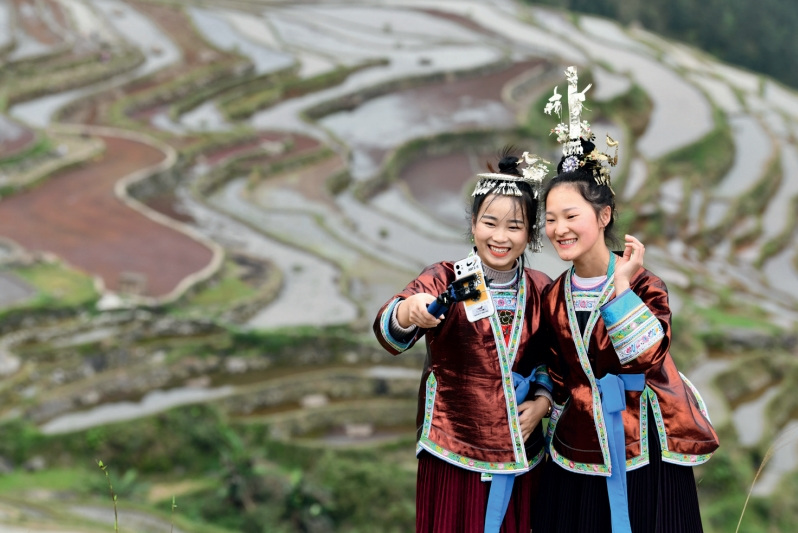 >> 在貴州省從江縣加榜鄉加車村,脫貧攻堅指揮所網格員吳賢艷(左)與村里的女大學生梁瓊英在直播推介加榜梯田風光(2020年4月19日攝)。