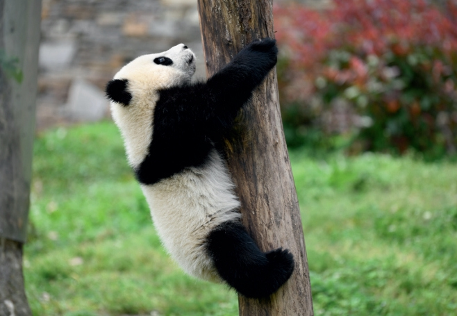 >> 2022年4月24日,在中國大熊貓保護研究中心臥龍神樹坪基地內,一只大熊貓在爬樹。