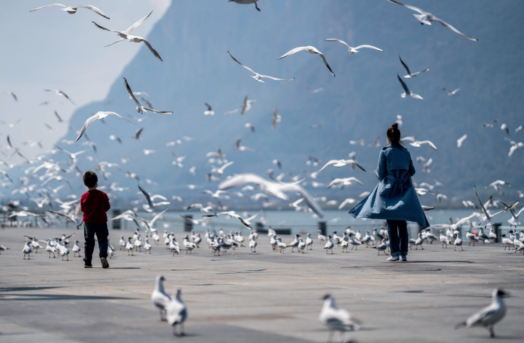 >> 市民在昆明市草海大壩觀賞紅嘴鷗(資料照片)。