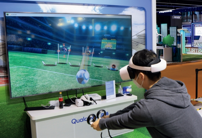 >> 2022年11月5日至10日,第五屆中國國際進口博覽會在國家會展中心(上海)舉行。超過280家世界500強和行業龍頭企業參加本屆進博會企業商業展,回頭率近90%,更有不少企業已提前簽約第六屆進博會。圖為參觀者在美國高通公司展臺參加5G無界XR賽事體驗。