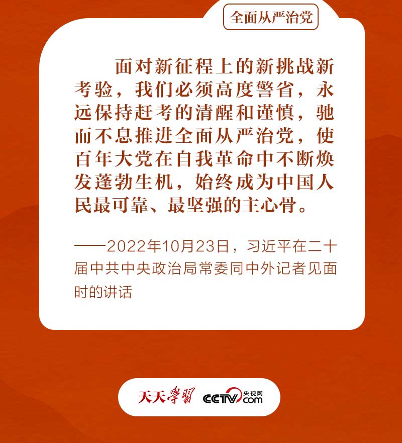 黨的二十大報告明確提出,“全面從嚴治黨永遠在路上,黨的自我革命永遠在路上”,為堅持不懈把全面從嚴治黨向縱深推進、確保黨永葆旺盛生命力和強大戰斗力指明了方向。