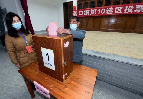 >> 在浙江省杭州市臨安區湍口鎮迎豐村的一個基層人大換屆選舉投票站,村民在參加投票,村級監察聯絡員監票。