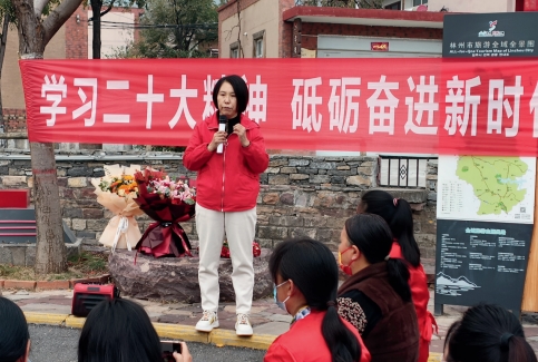 >> 2022年10月27日,在河南省林州市黃華鎮廟荒村村口,黨的二十大代表、廟荒村黨支部書記郁林英和鄉親們分享參加黨的二十大的感受和收獲。